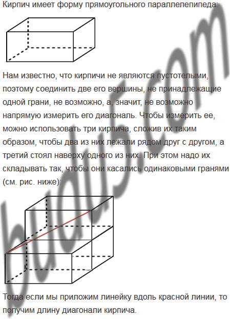 Как с помощью линейки измерить диагональ кирпича, имея ещё несколько таких кирпичей? (Диагональ параллелепипеда - это отрезок, соединяющий две его вершины, не принадлежащие одной грани.)