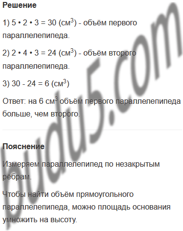Задание № 6. Прямоугольные параллелепипеды составлены из кубиков с ребром в 1 см. Некоторые кубики спрятались. Найди их объёмы и узнай, объём какого параллелепипеда больше и на сколько?