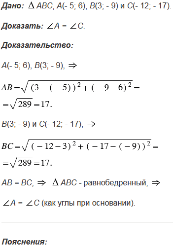 Докажите, что углы А и С треугольника АВС равны, если А(- 5; 6), В(3; - 9) и С(- 12; - 17).