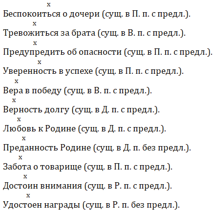 I. Беспокоиться (о) (дочь), тревожиться (за) (брат), предупредить (об) (опасность), предостеречь (от) (ошибка).